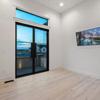Single-pane transom window with a thin iron frame. Window is thermally broken to protect from extreme weather.