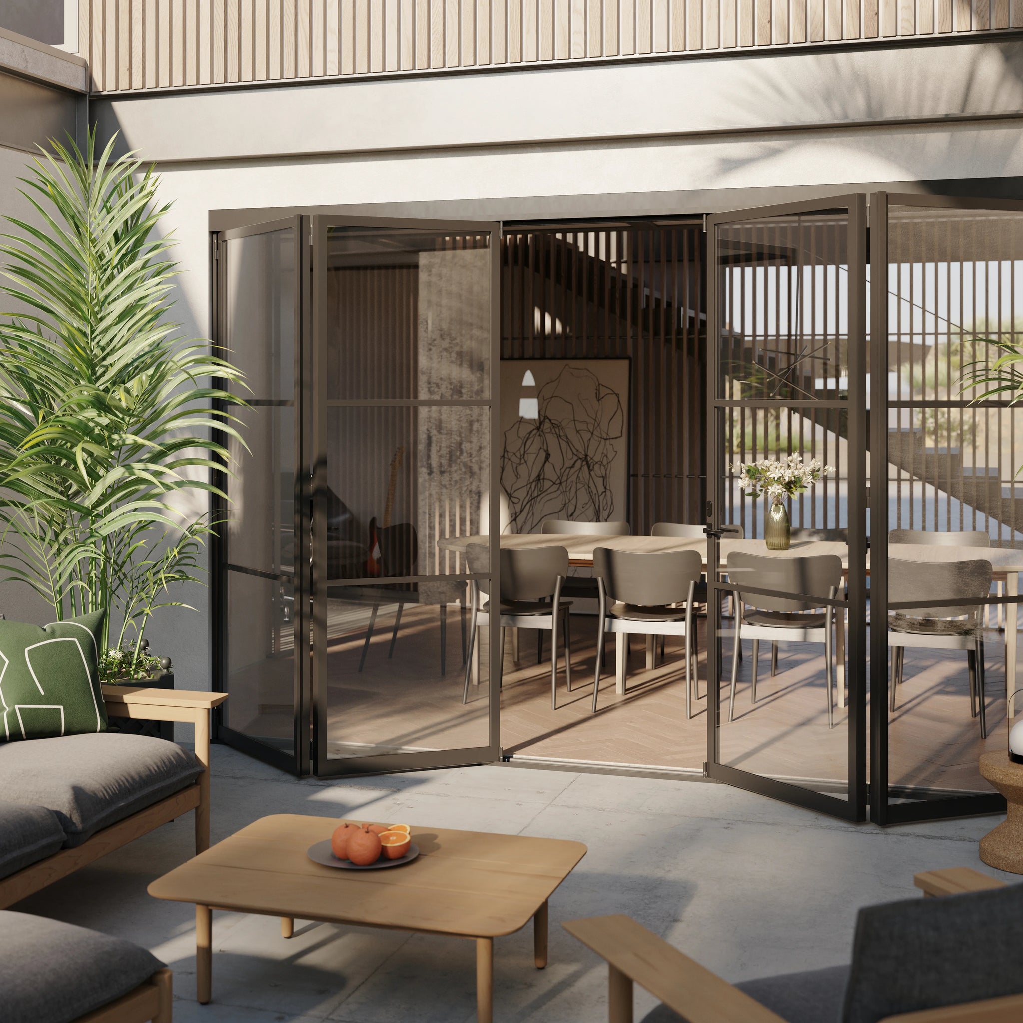 The images shown are for illustration purposes only and may not be an exact representation of the product. Lock sold separately. Air 4 Doors 120" tall and over will have 4 Glass Panes per panel. All Thermally Broken Doors have 3” Nailing Fin all around. A black spacer separating any dual pane glass will be visible on all colors other than black.